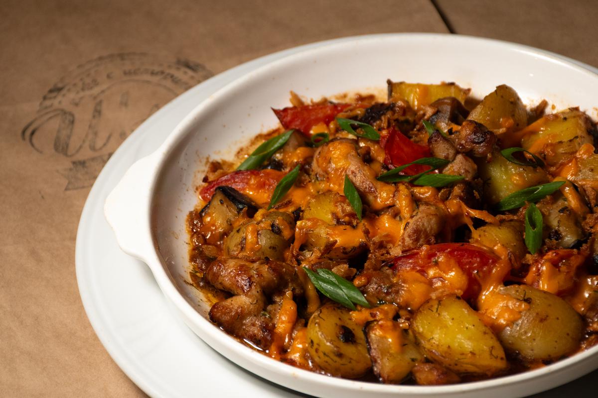 Кабачки, баклажаны, сладкий перец, картофель, шампиньоны, сыр чеддер, хрустящий лук