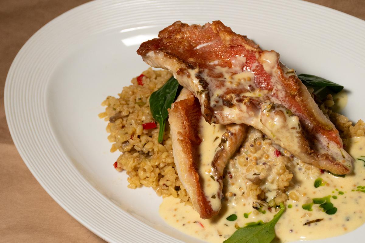 Гарнир из булгура со сладким перцем и грибами, горчичный соус