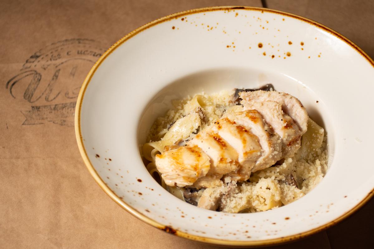 Сливочный соус, цыпленок, грибы, сыр пармезан, трюфельная паста
