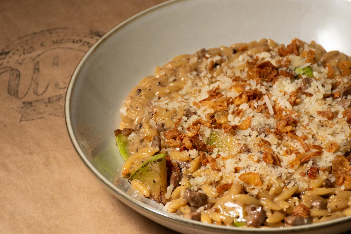 Перечный соус, цукини, хрустящий лук, сыр пармезан