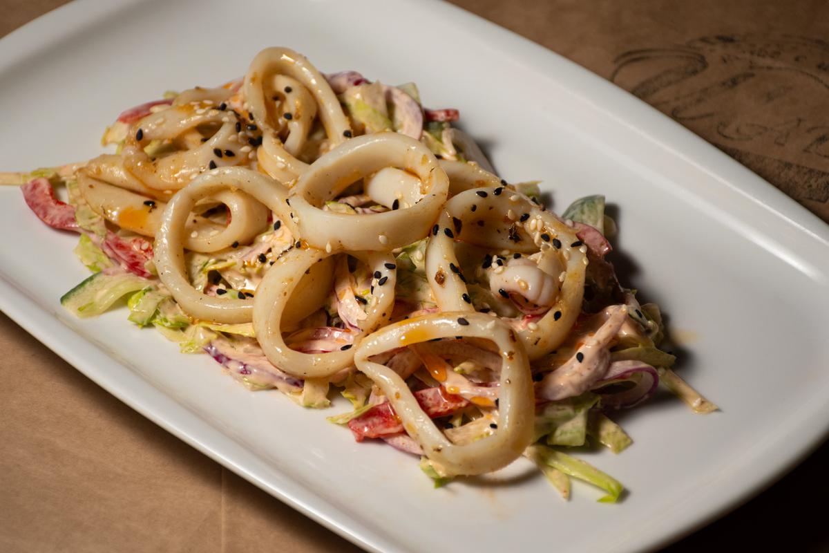 Айсберг, красный лук, огурец, сладкий перец, кунжут, сливочный соус чили